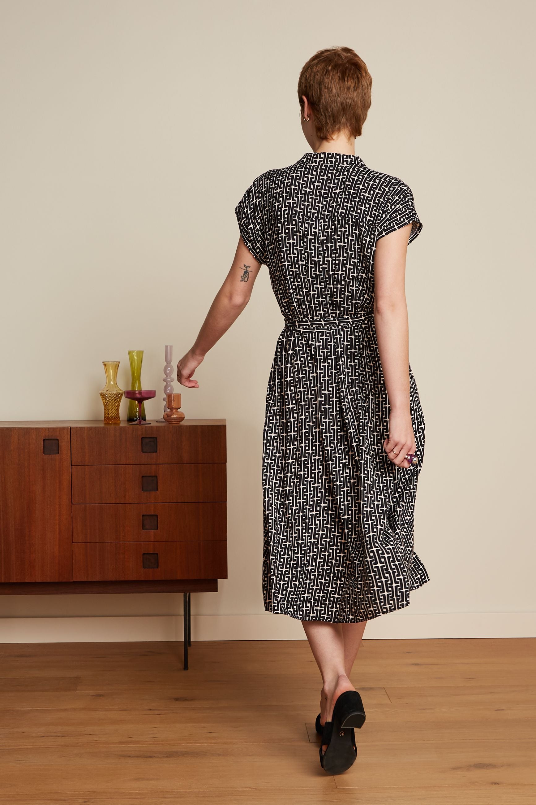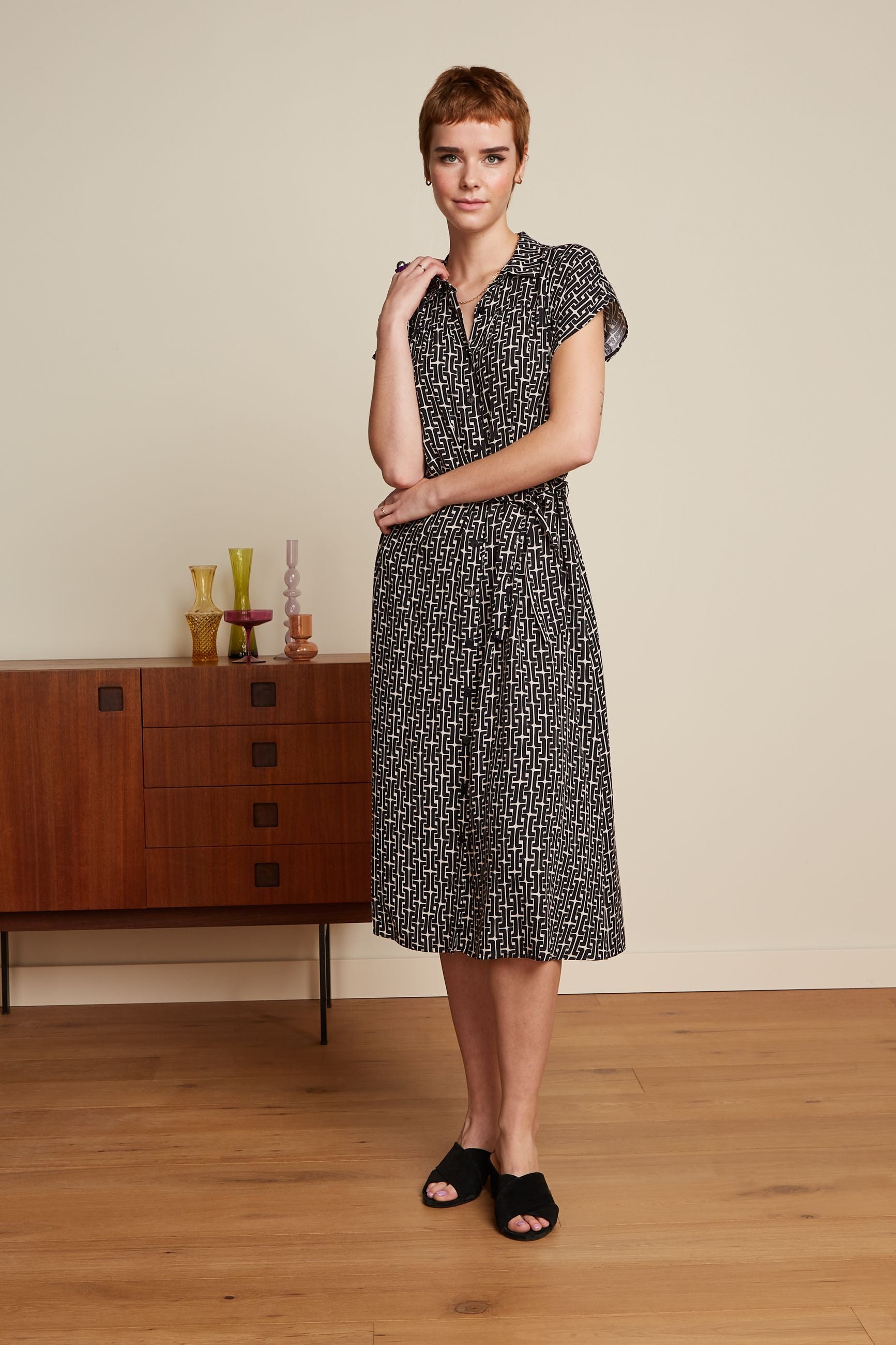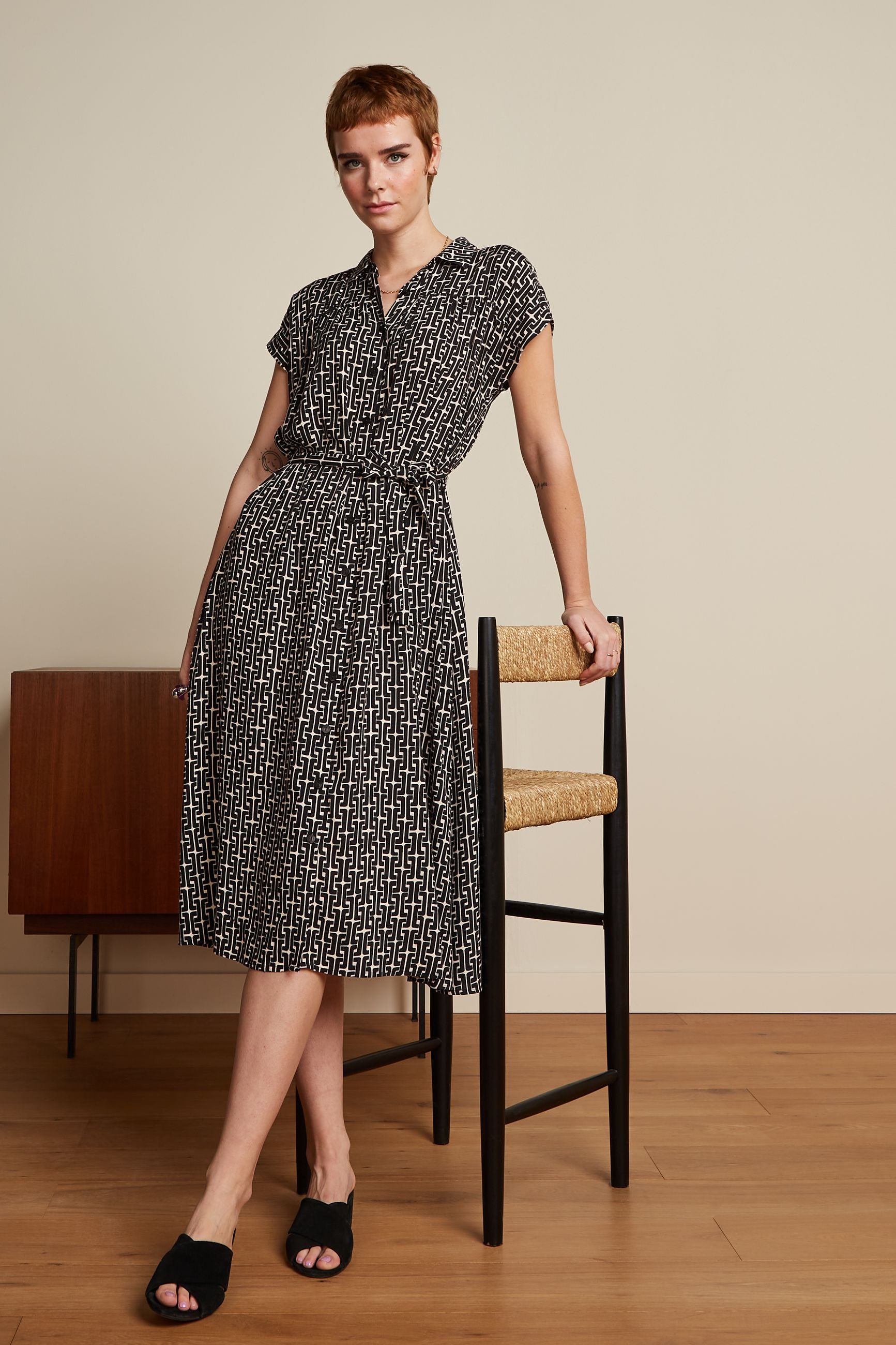 Dieses Blusenkleid mit klassischem Kragen und kurzen, angeschnittenen Ärmeln ist ein echter Hingucker. Der stoffeigene Bindegürtel und die durchgehende Knopfleiste sorgen für eine perfekte Passform und einen femininen Look. Hergestellt aus nachhaltiger Viskose in einem Webstoff, besticht das Kleid durch seine fließende Qualität und den modernen Grafikprint.