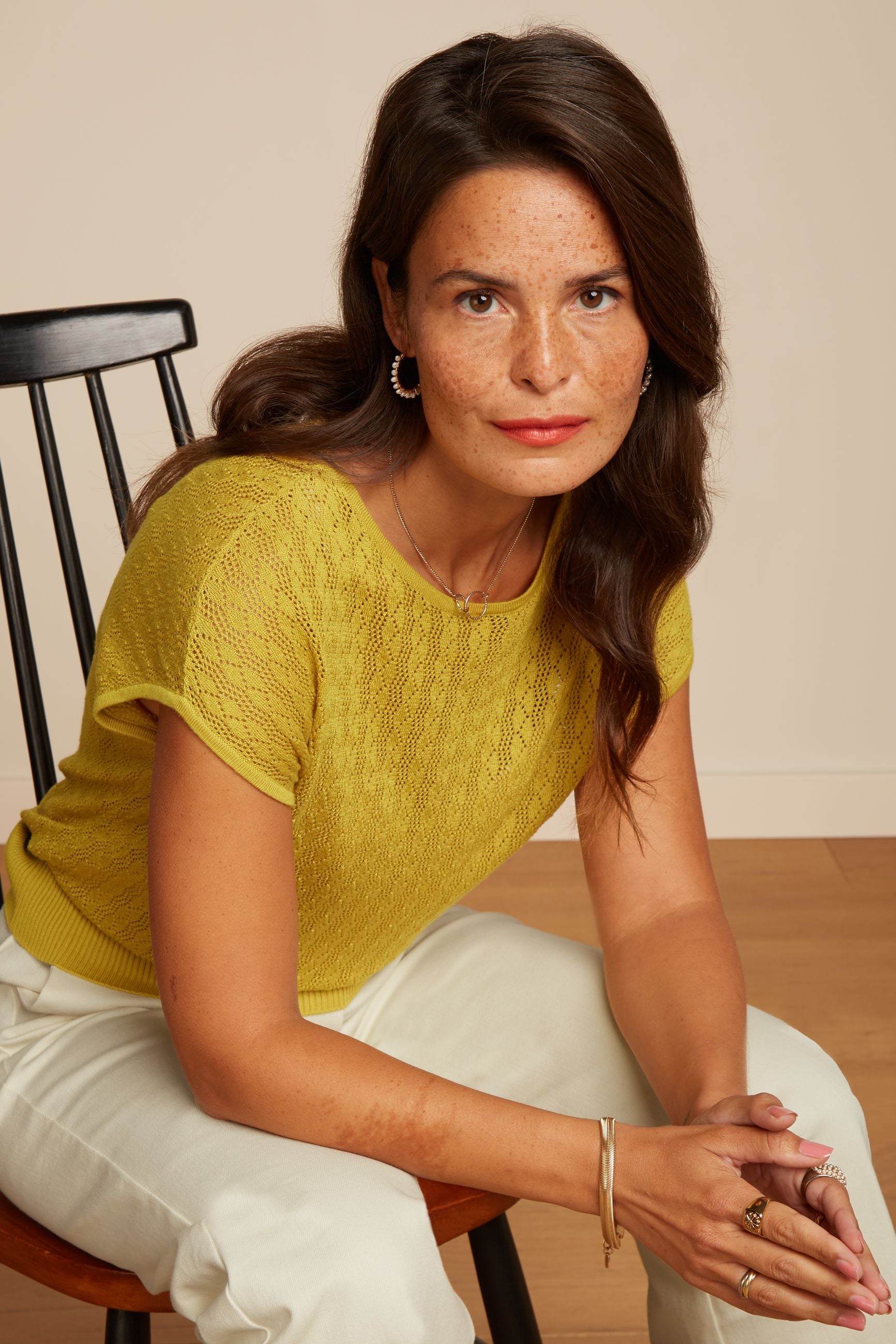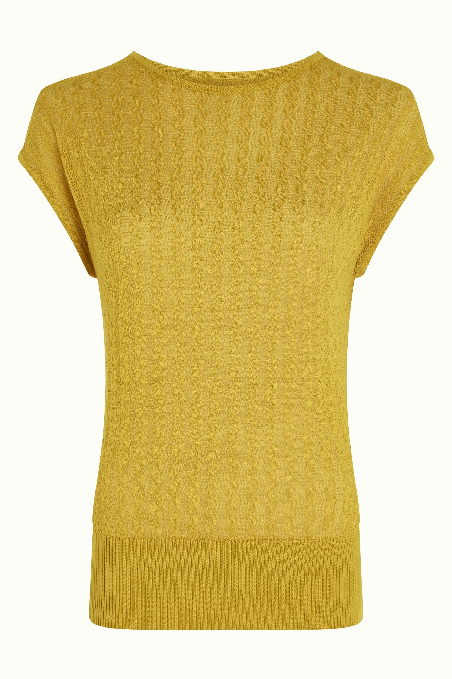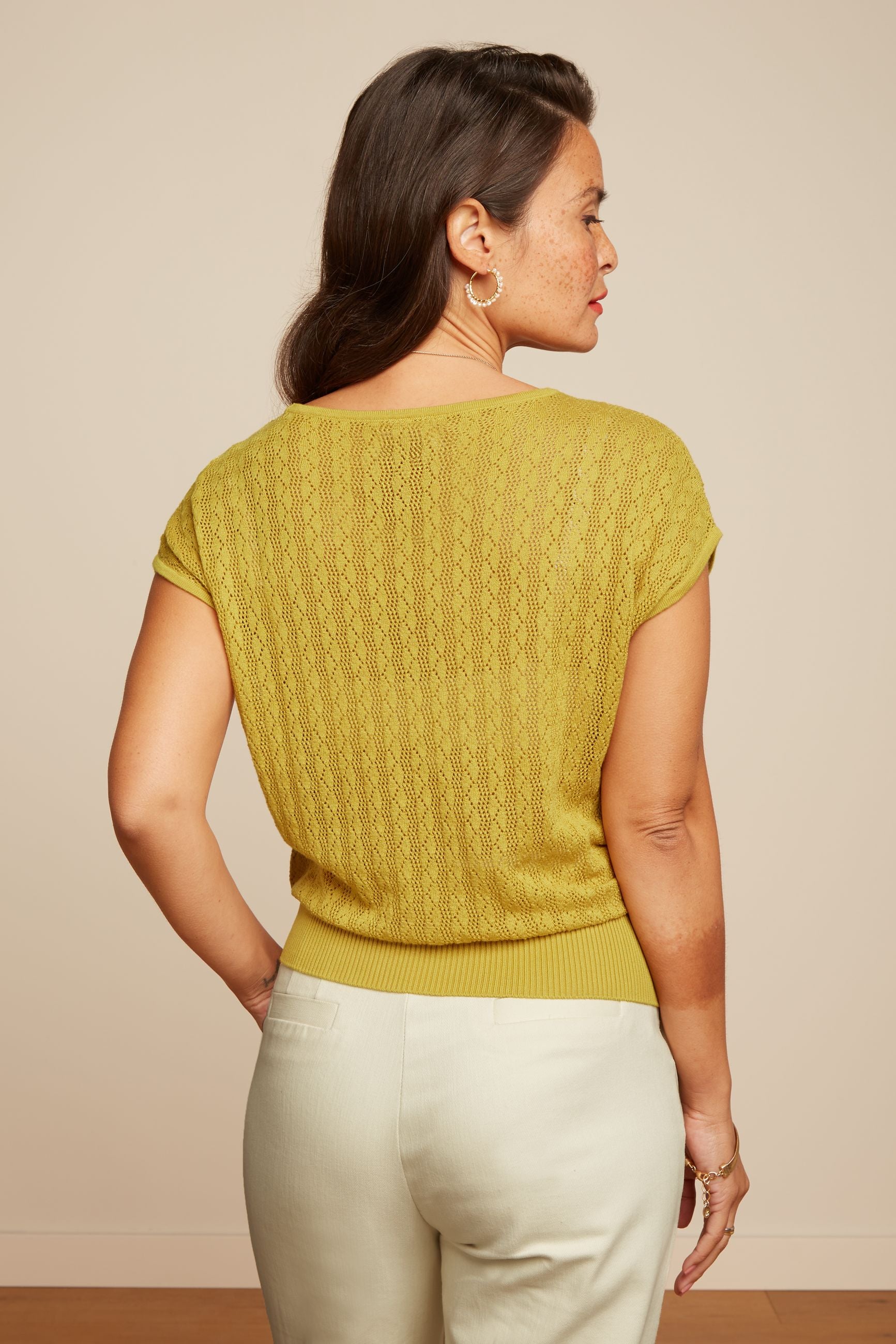 Top von King Louie mit Rundhalsausschnitt, taillierter Passform und überschnittenen Schultern für einen lässigen Look. Die gerippten Abschlussbündchen am Saum bieten höchsten Tragekomfort. Das Ajour-Strickmuster verleiht dem Strick-Top eine besondere Note. Hergestellt aus nachhaltigen Materialien, wie Baumwolle aus ausrangierten Pullovern und recycelten PET-Flaschen.