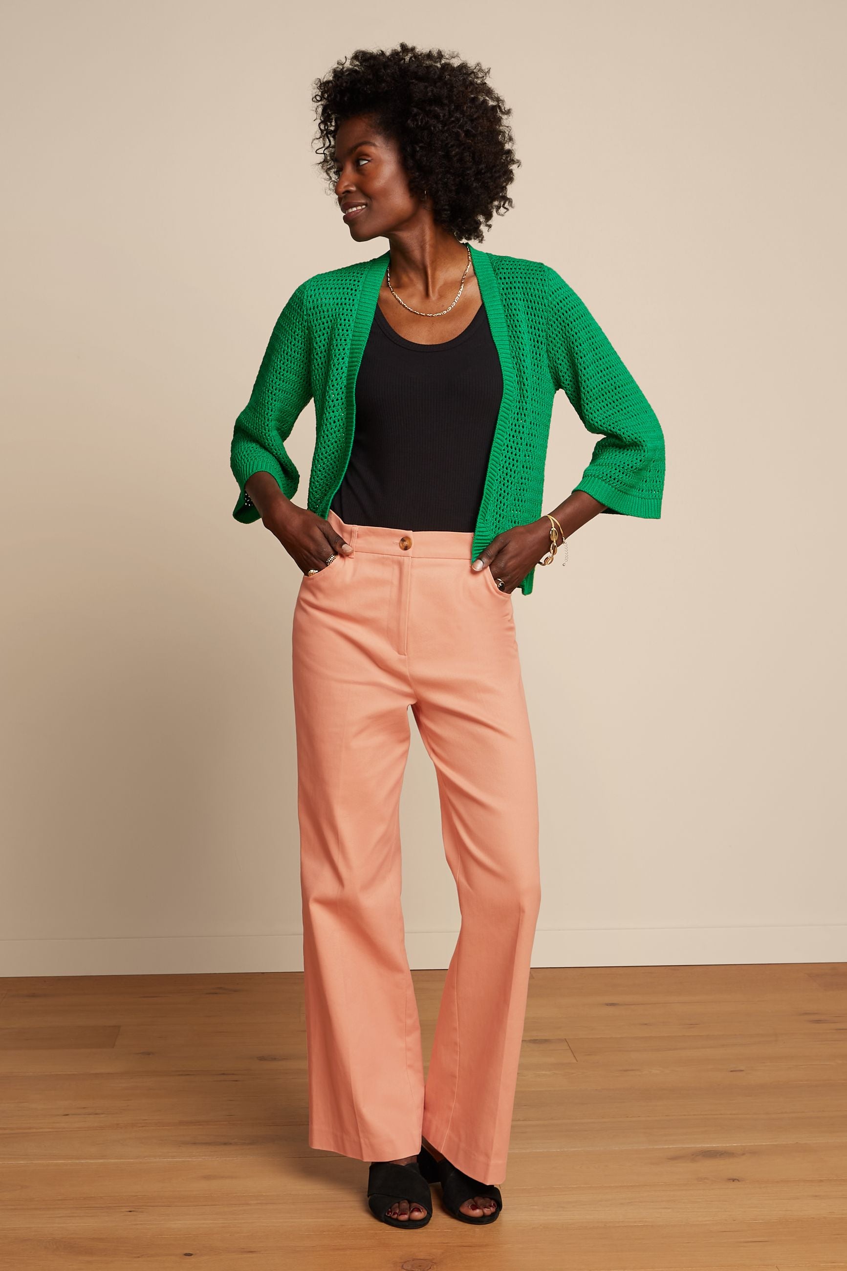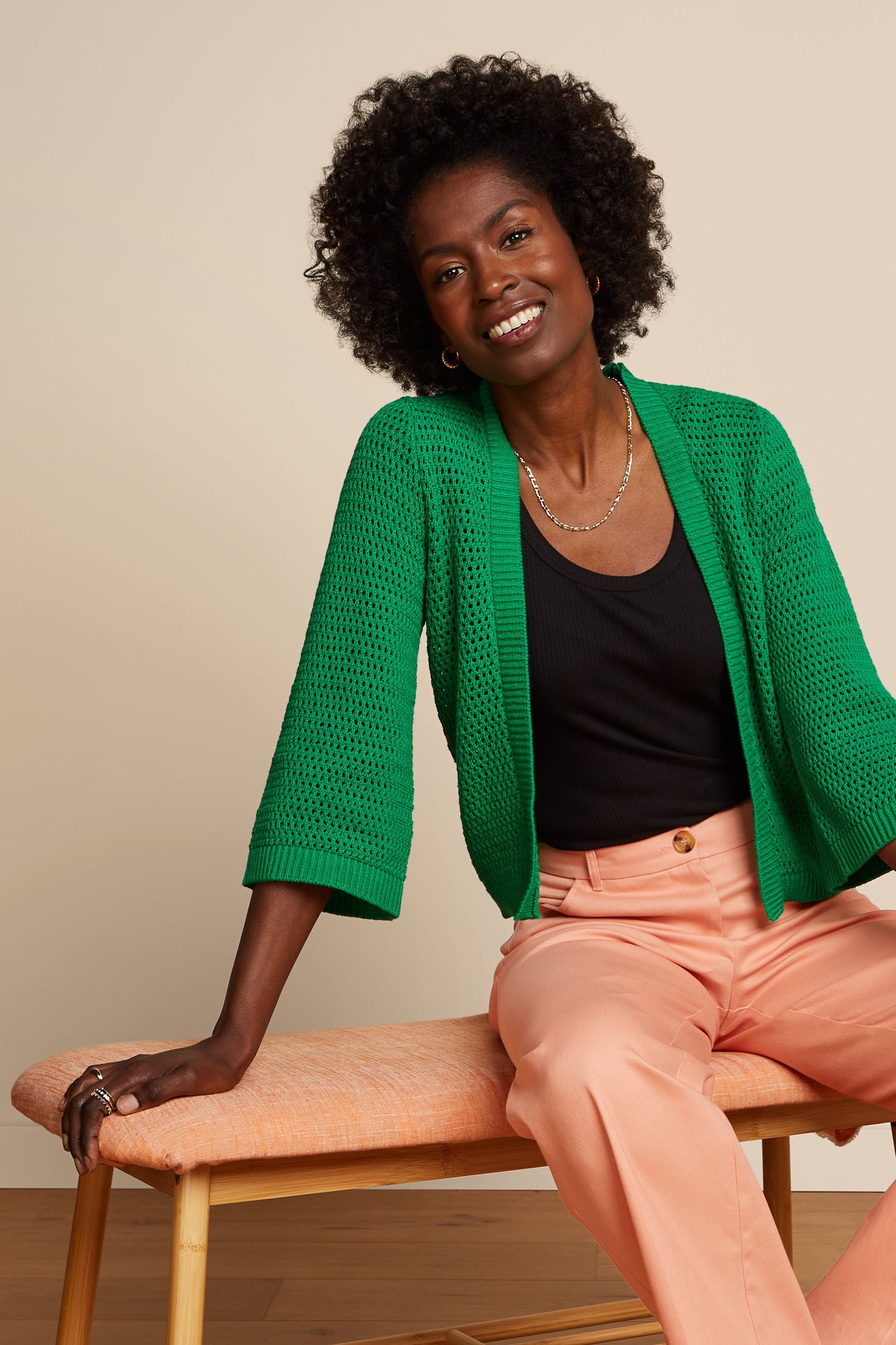 Diese Kimono Strickjacke ist ein vielseitiges Kleidungsstück mit einer offenen Silhouette und 3/4 Ärmeln. Sie bietet einen angenehmen Stretchkomfort und passt perfekt zu verschiedenen Outfits. Ob als lässige Ergänzung zu einem T-Shirt und Jeans oder als elegante Überwurfjacke zu einem Kleid, diese Strickjacke ist ein Must-Have für jede Garderobe.