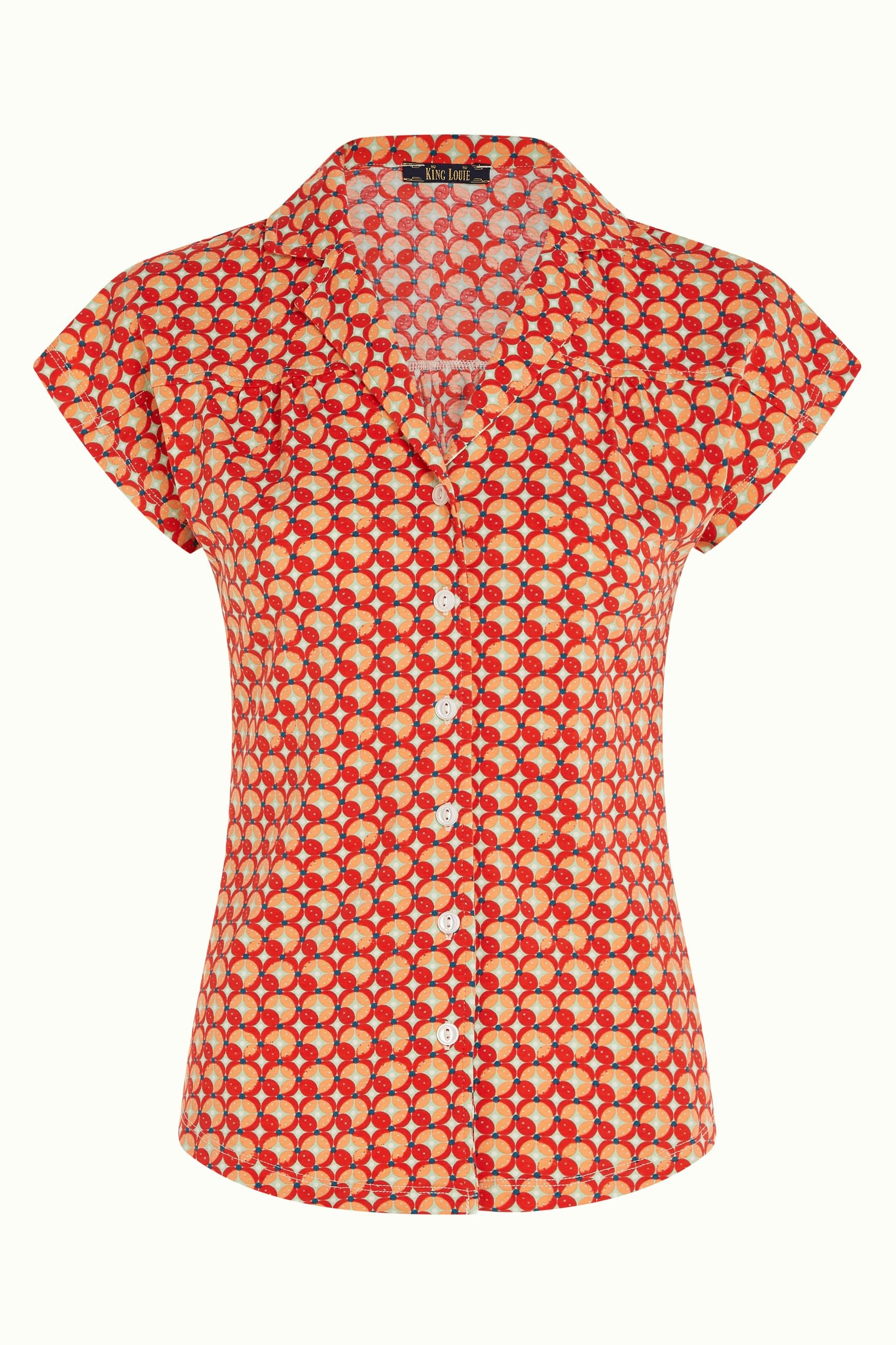 Mit einer taillierten Passform, überschnittenen Schultern und einem Reverskragen bietet dieses Blusenshirt von King Louie nicht nur ein modernes Design, sondern auch einen tollen Stretchkomfort und eine abgesetzte Passe mit Raffungen auf Vorder- und Rückseite. Hergestellt aus 95% GOTS-zertifizierter Bio-Baumwolle und 5% Elastan, ist sie nicht nur umweltfreundlich, sondern auch angenehm zu tragen.