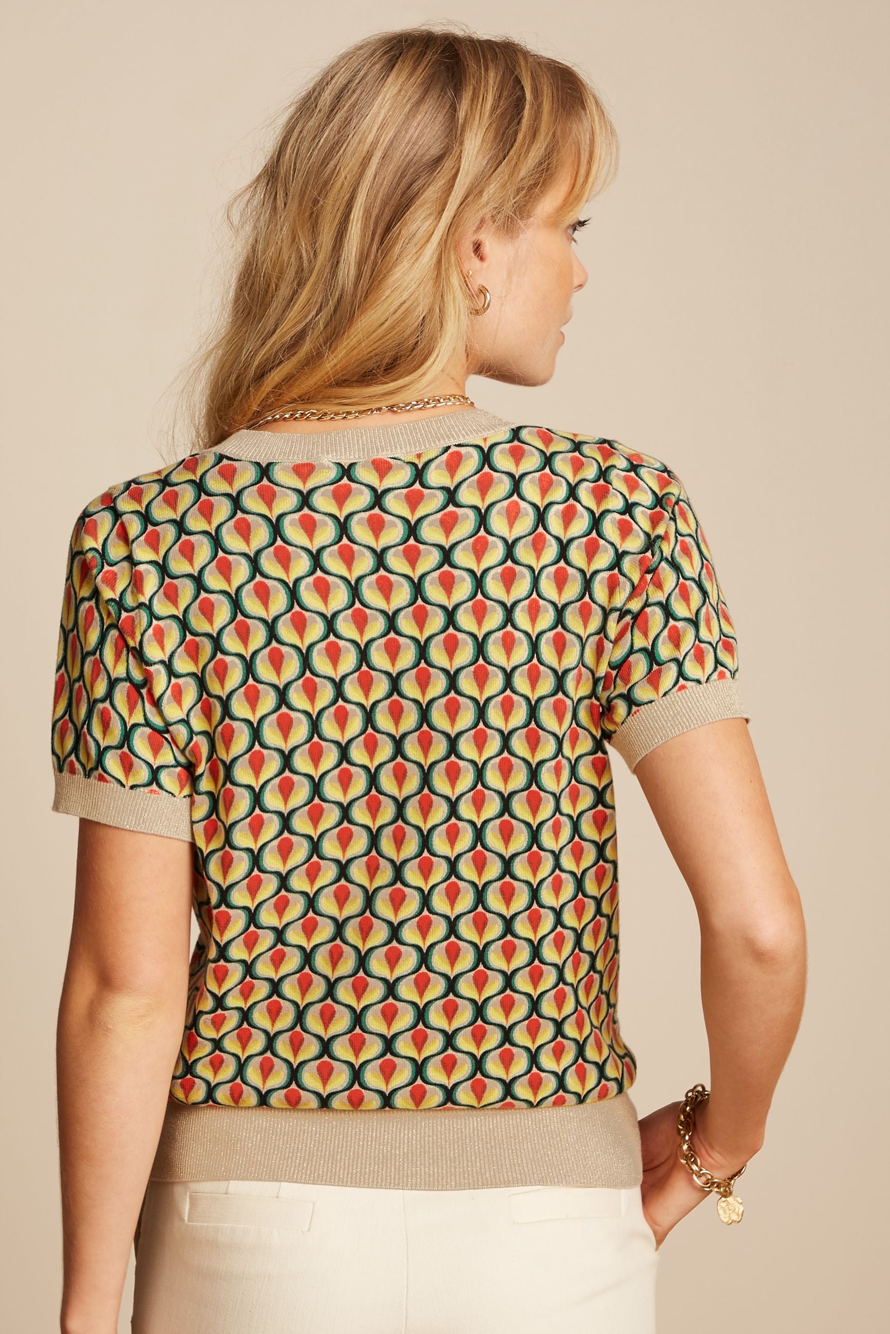 Dieses Strick-Top mit grafischem Muster ist ein absolutes Must-Have für jede modebewusste Frau. Mit seiner taillierten Passform und dem klassischen Rundhalsausschnitt sorgt es für eine feminine Silhouette. Die gerippten Abschlussbündchen verleihen dem Top einen modernen Look und die kurzen Ärmel machen es perfekt für den Sommer. Dank des Stretchkomforts bietet es zudem eine optimale Passform und hohen Tragekomfort. Ein vielseitiges und stylisches Kleidungsstück, das in keiner Garderobe fehlen sollte.