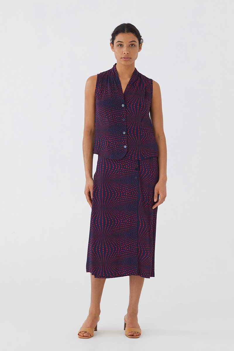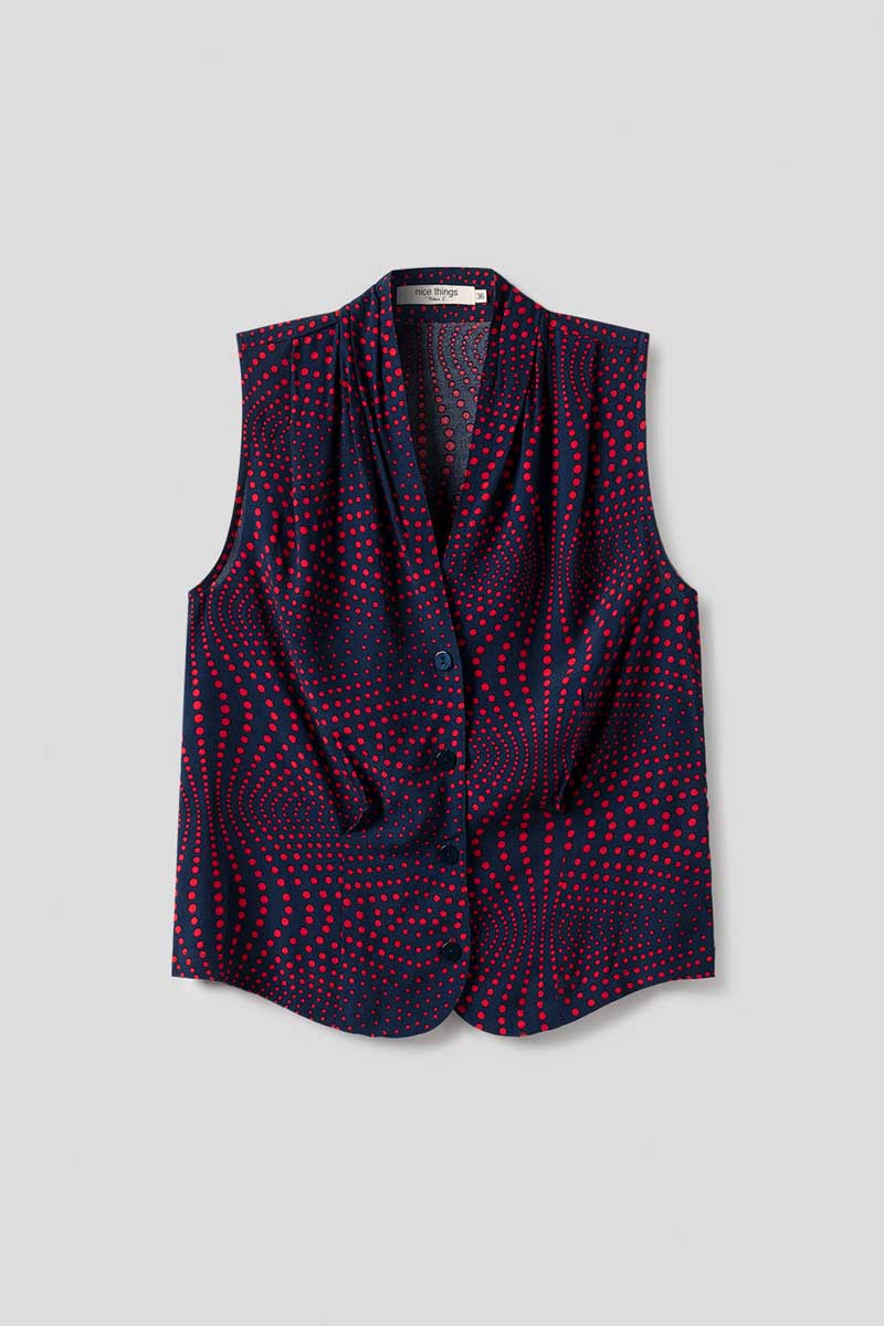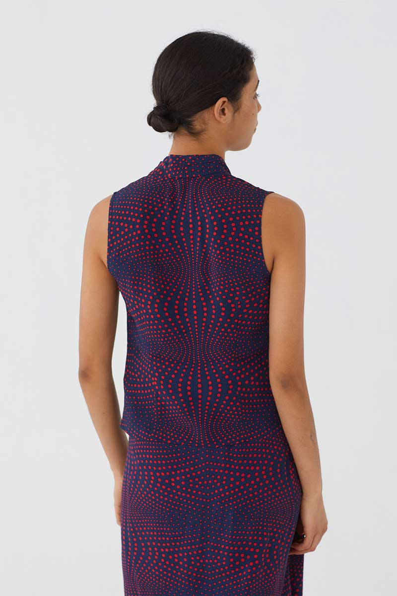 Dunkel-Blaue, ärmellose Bluse mit rotem Op Dot Print, V-Ausschnitt mit Falten und Knöpfen.