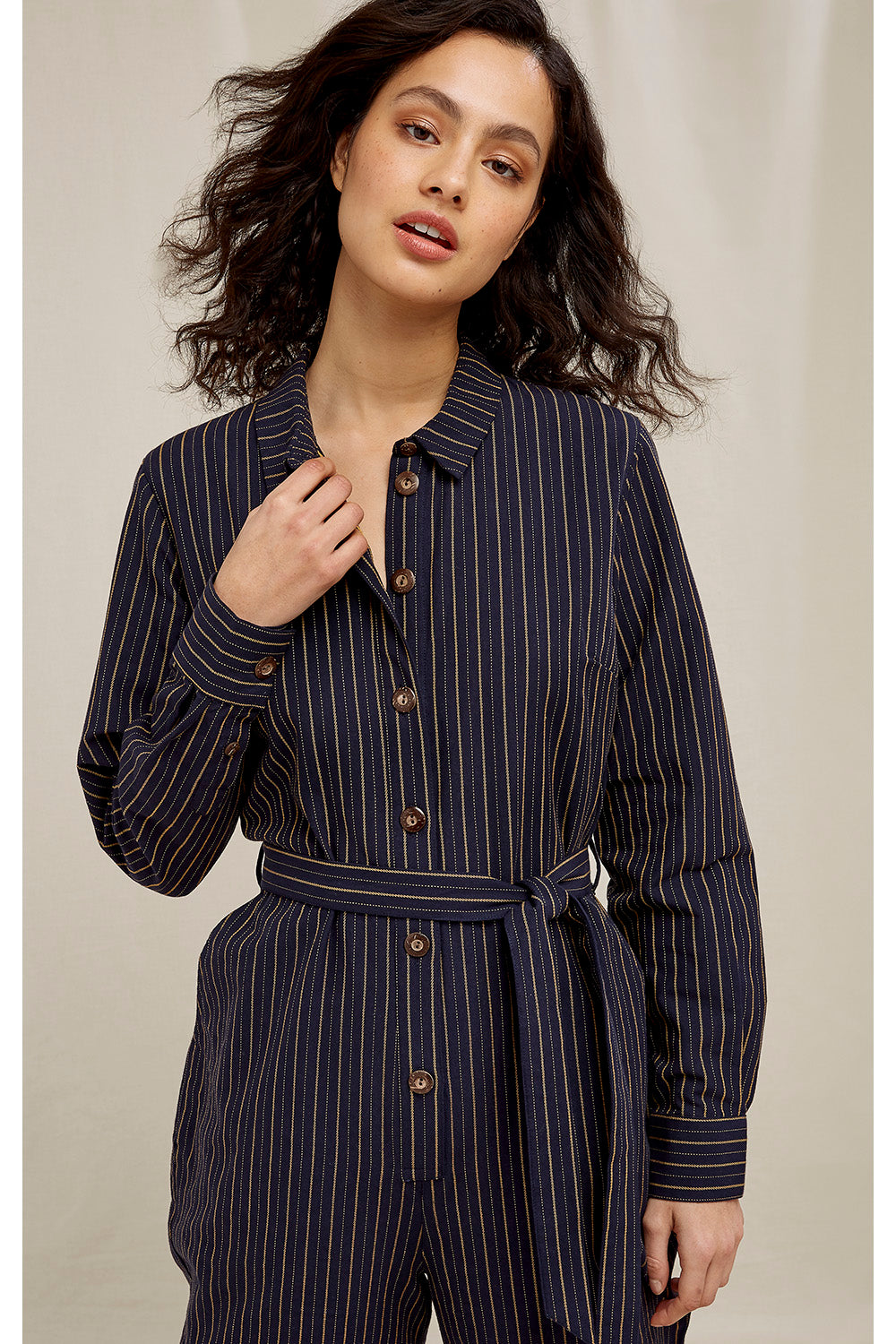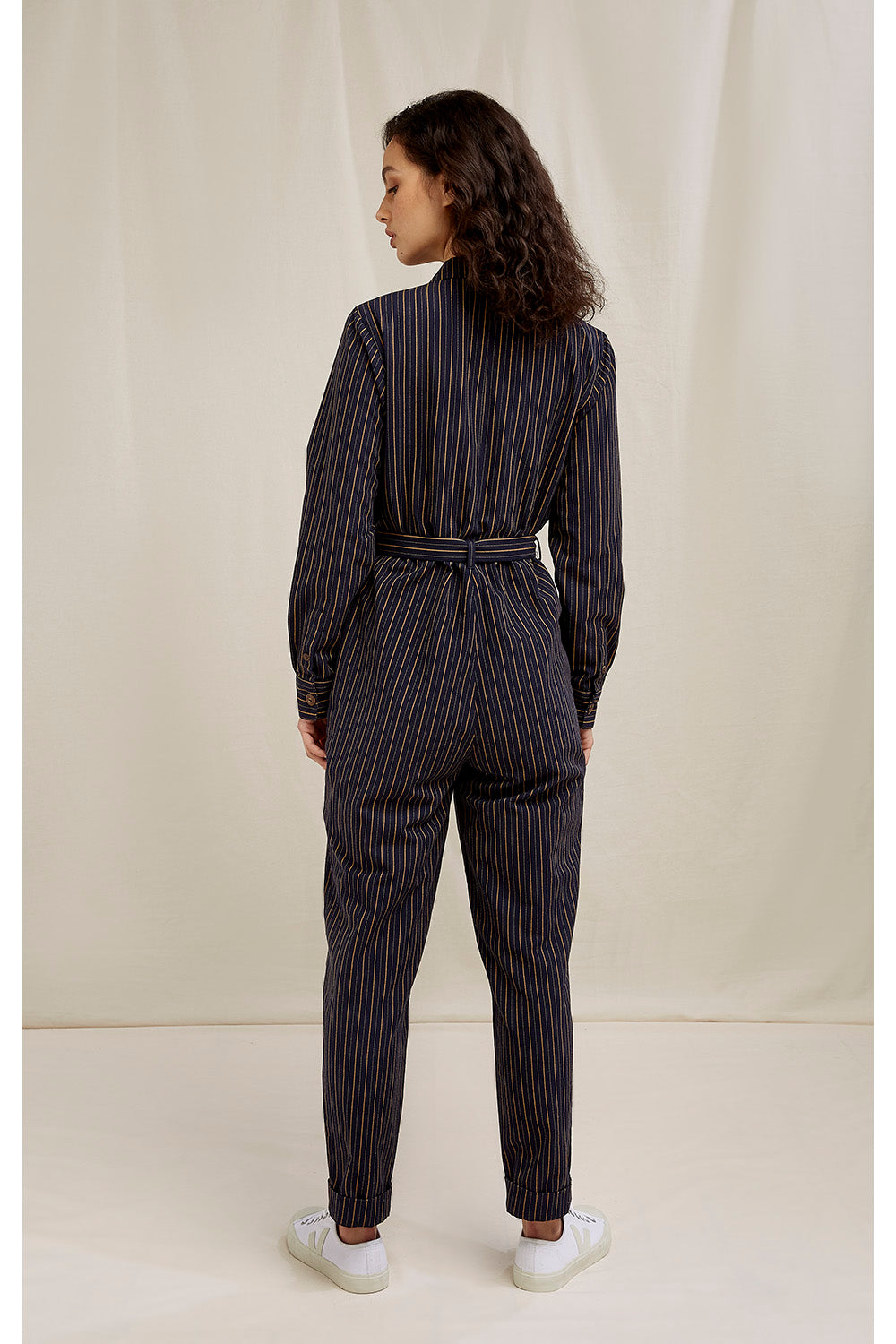 Handgewobener Jumpsuit mit durchgehender Knopfleiste und stoffeigenem Bindegürtel aus Bio Baumwolle aus fairer und nachhaltiger Produktion