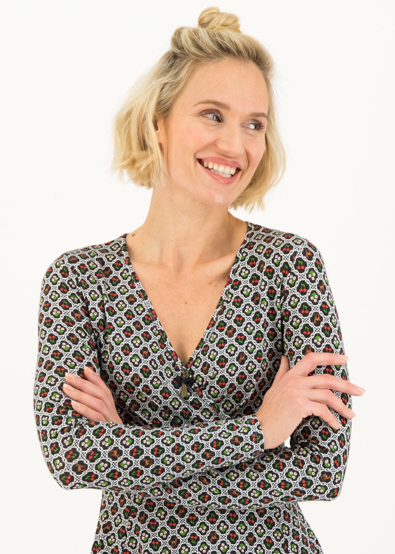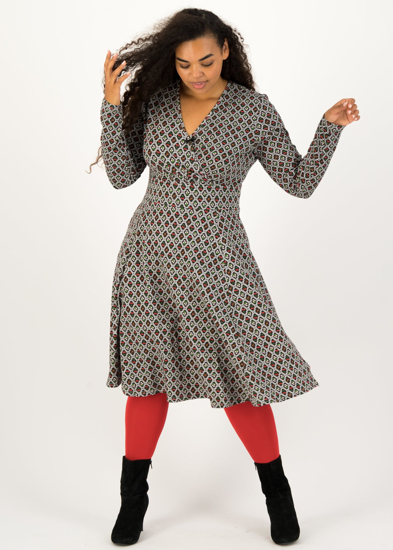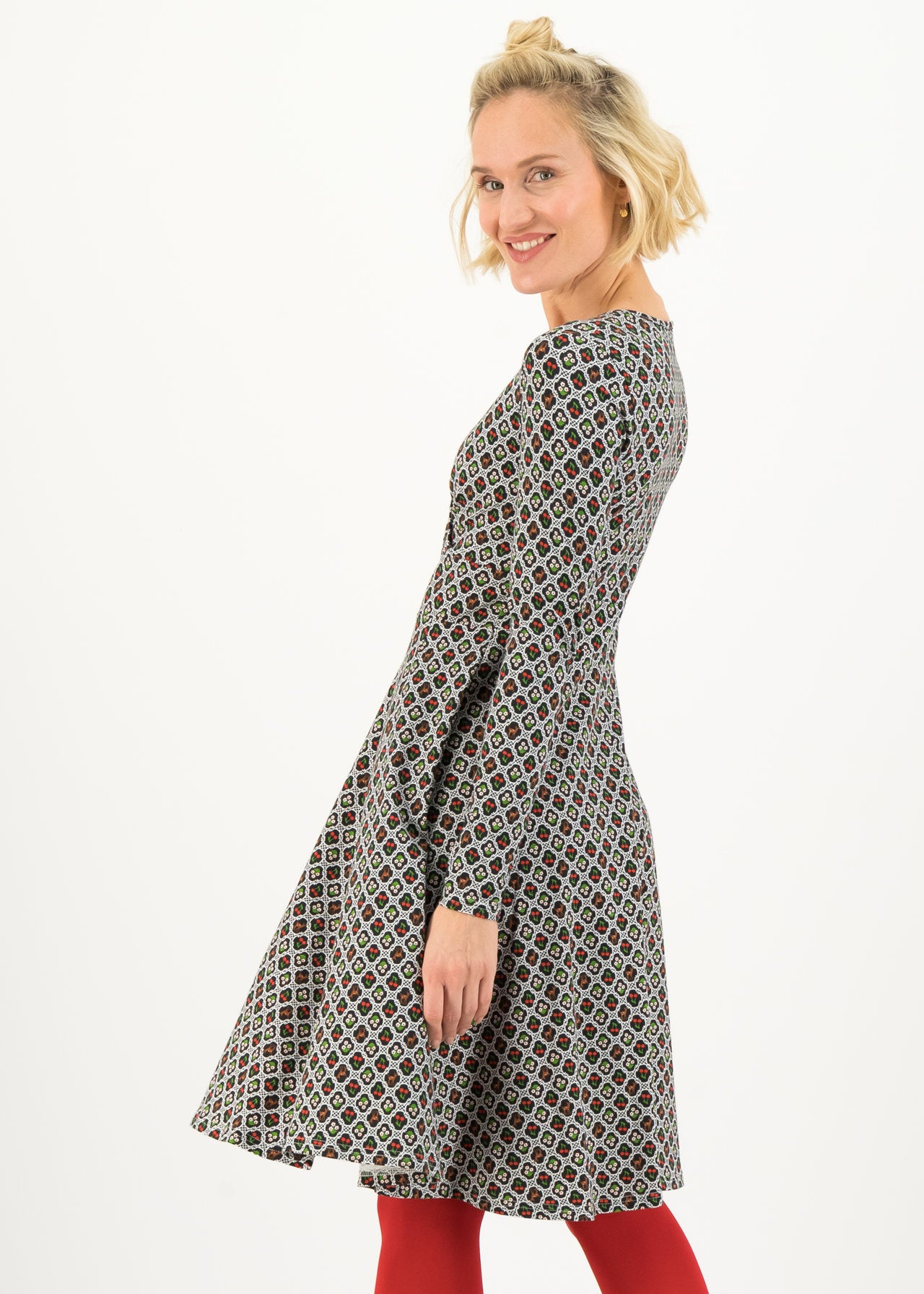 Gemütliches Wohlfühl-Kleid aus weichem Baumwoll-Elasthan-Jersey in Bio-Qualität. Automatisch einhergehend mit einer bezaubernd-femininen Silhouette versprechen der breite Taillenbund und ein weit ausgestellter Rockteil mit knieumspielender Länge Alltagstauglichkeit und Tragekomfort.