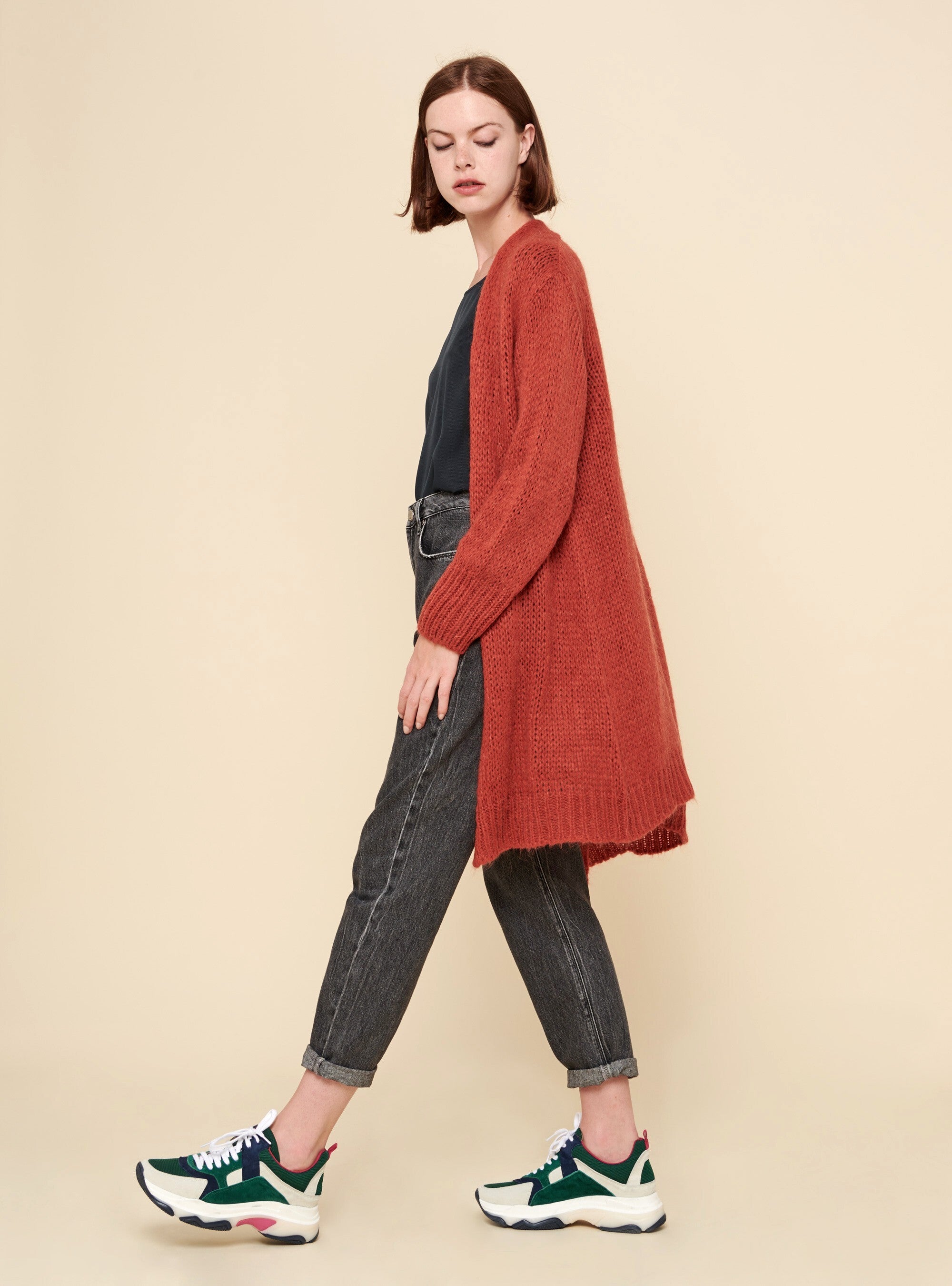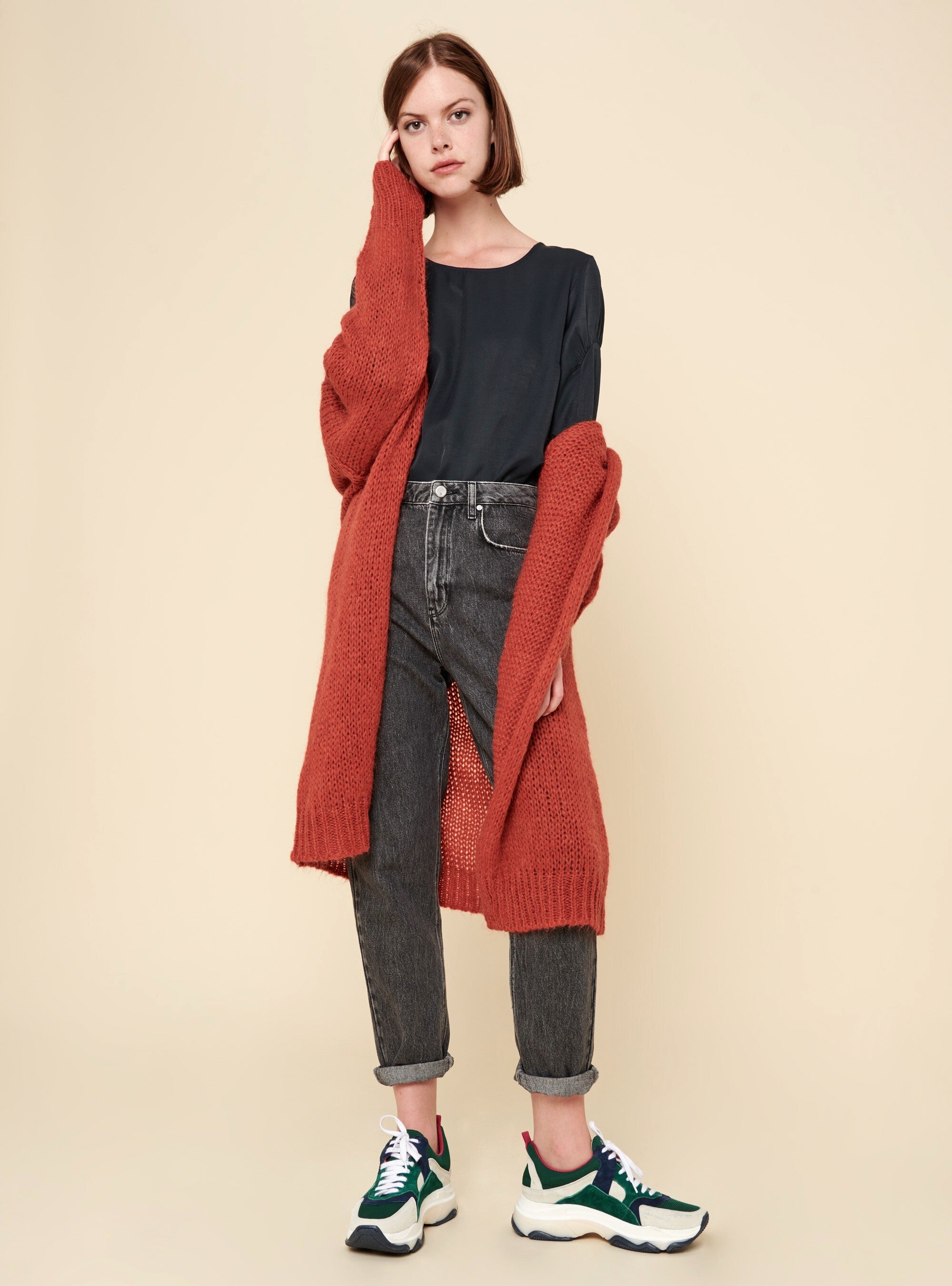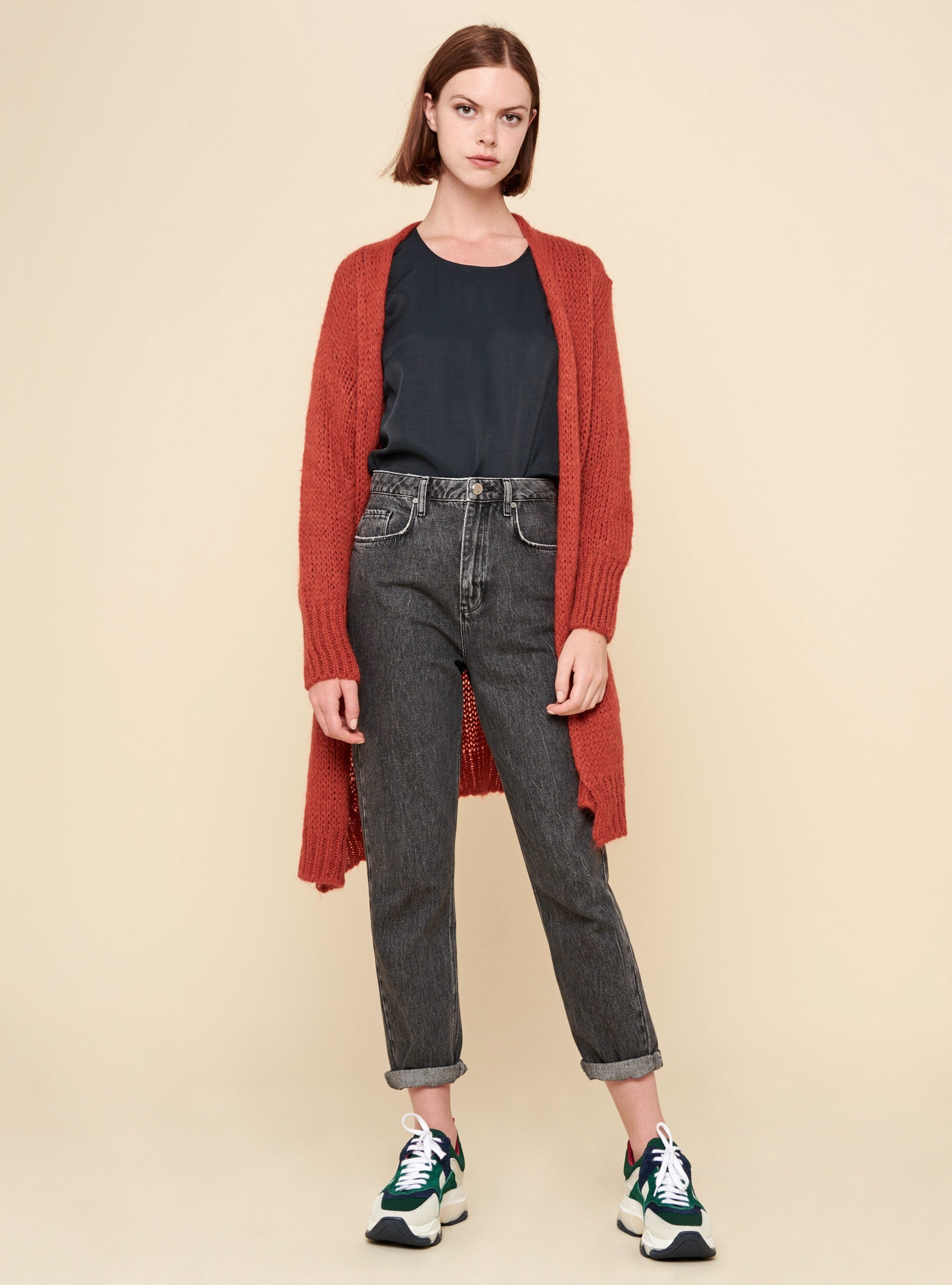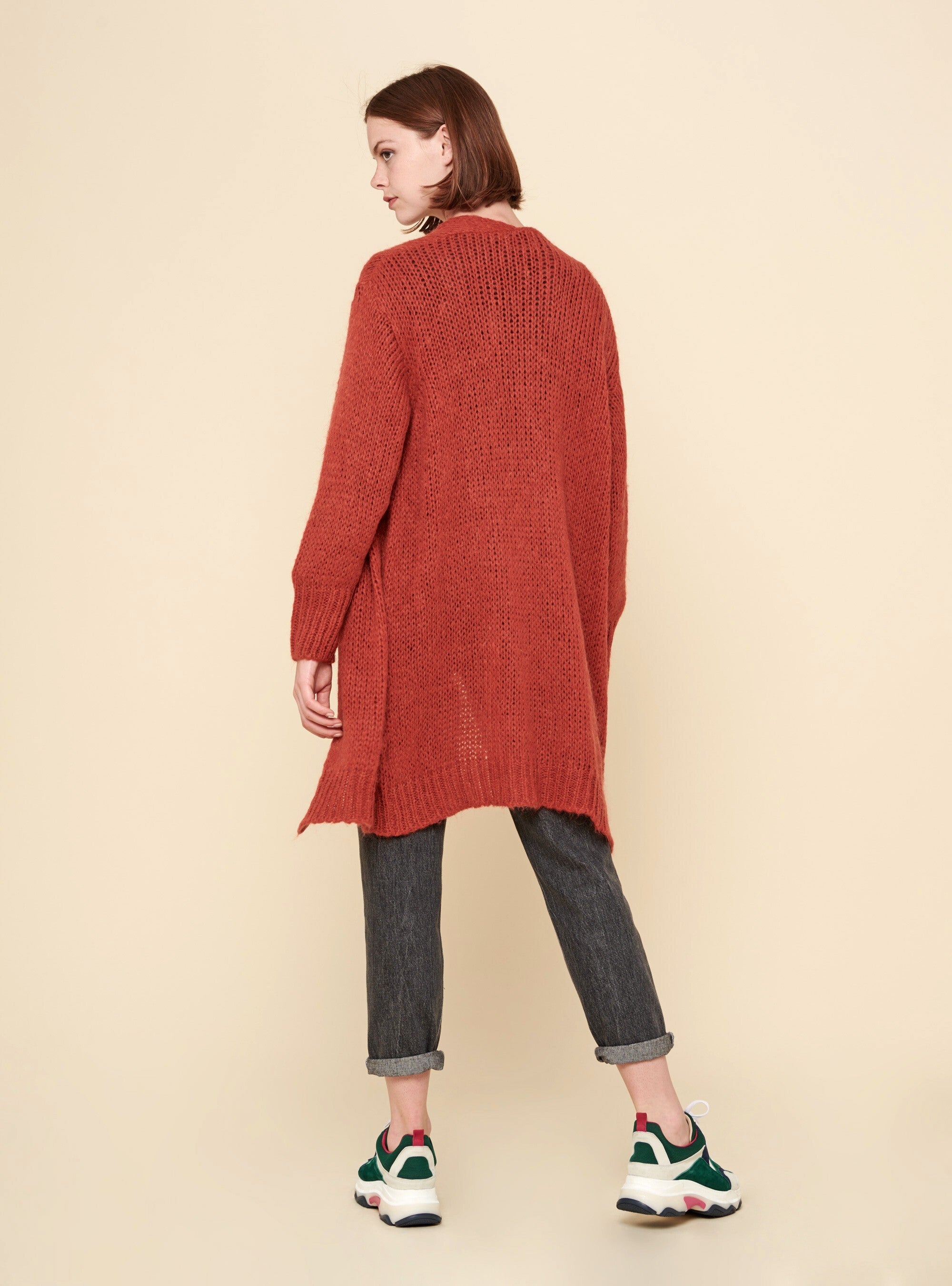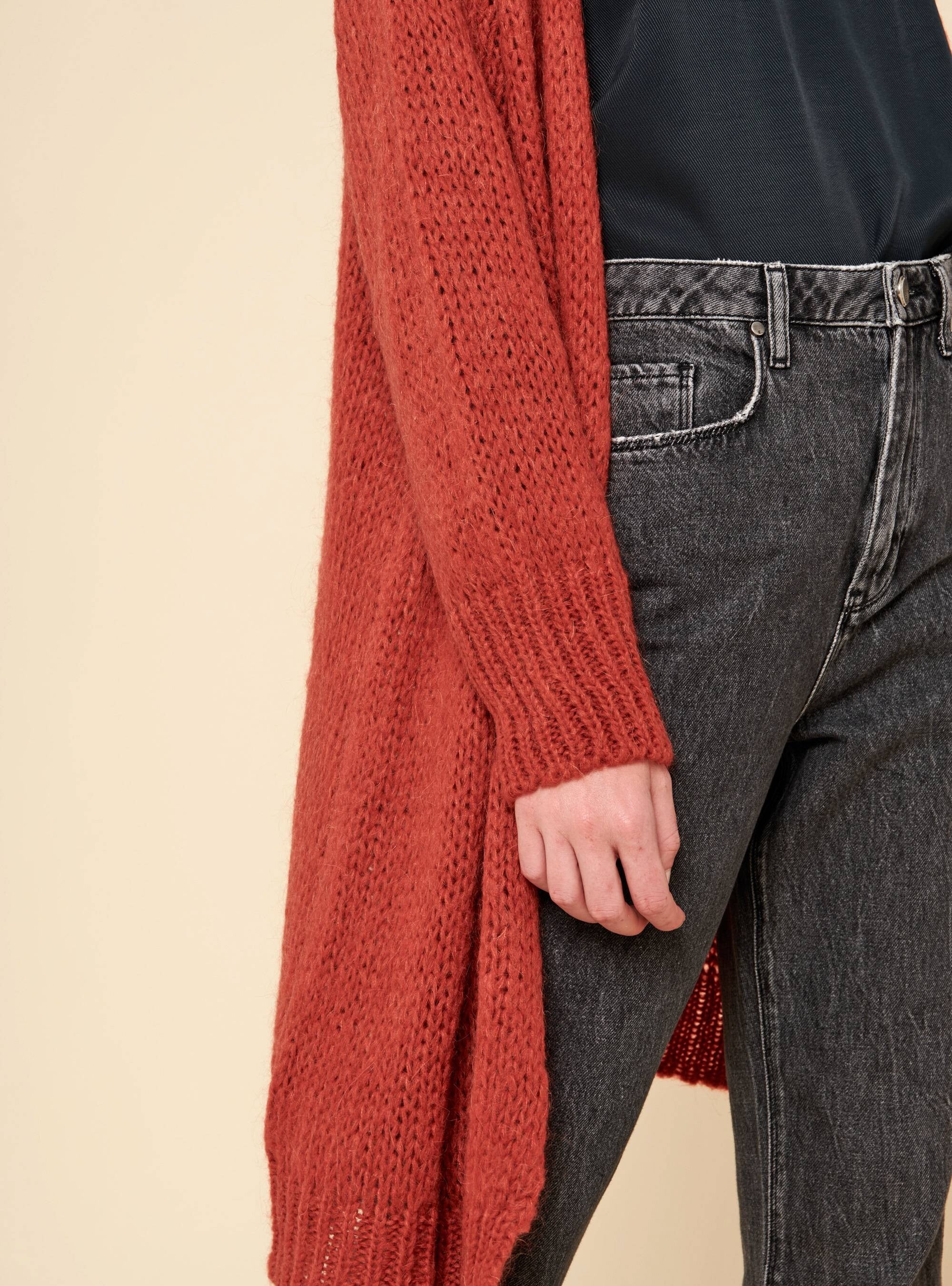 Sehr lange und offene Strickjacke aus Jersey-Strick.