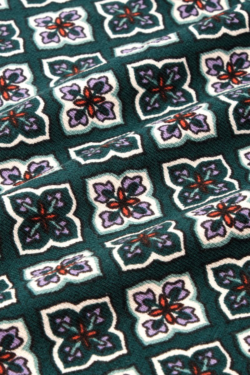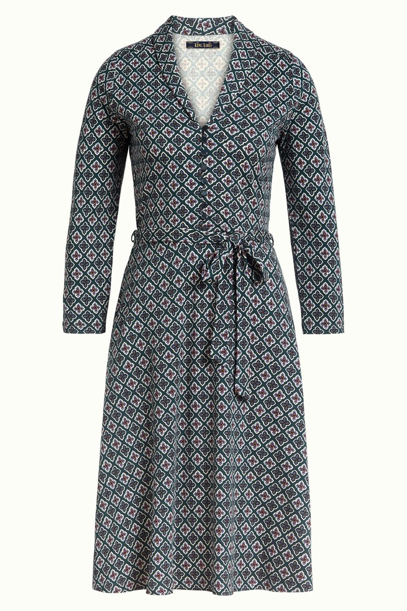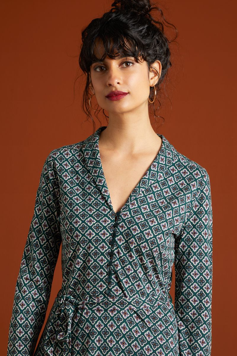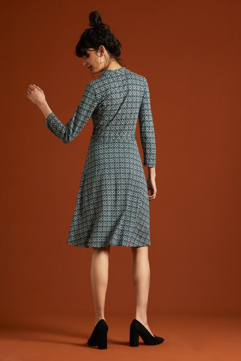 Tailliertes Jersey-Kleid mit grafischem Print,schmalem Schalkragen, Knopfleiste bis zur Taille und stoffeigenem Bindegürtel.