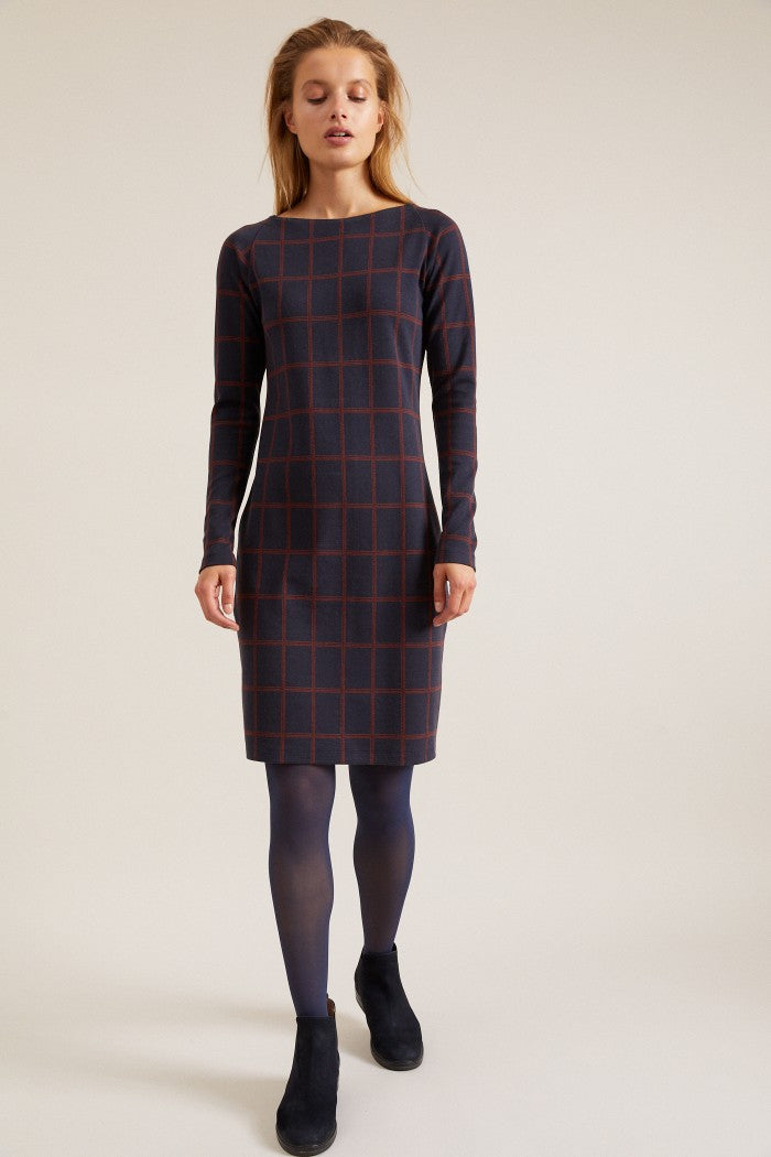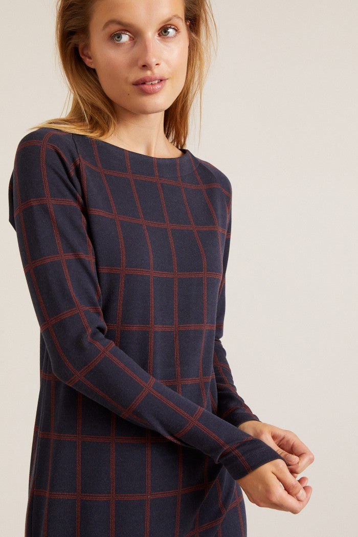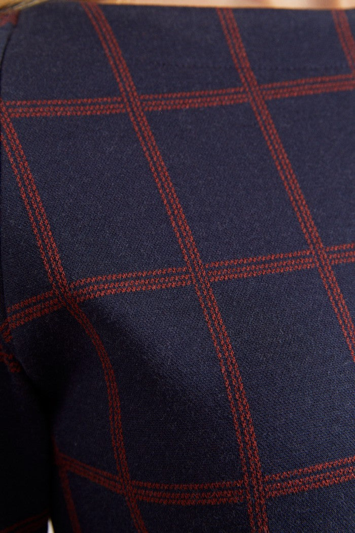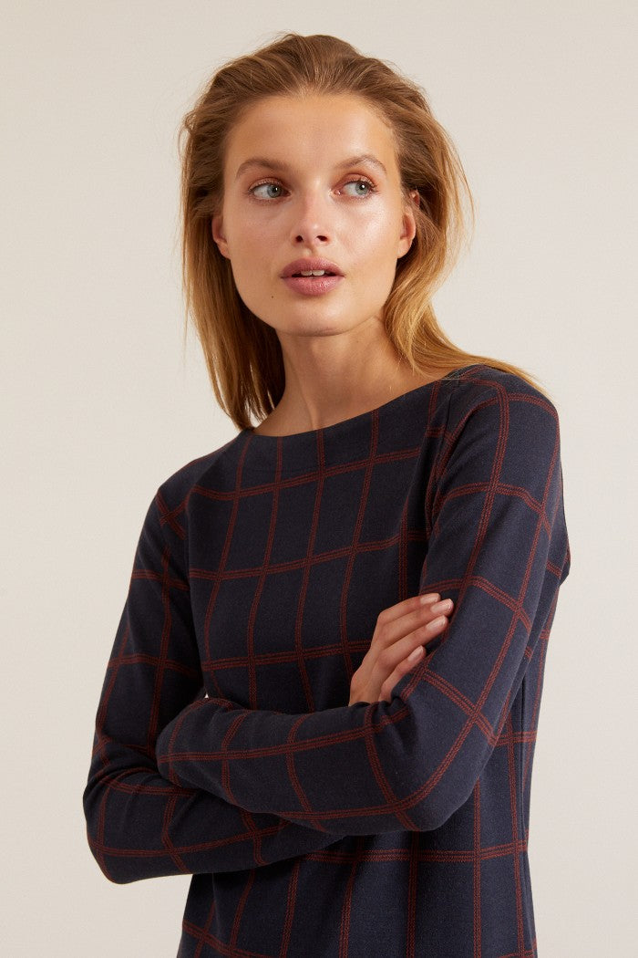 Jersey im Karodesign, körpernahe Silhouette. U-Boot-Ausschnitt, schmale Ärmel.