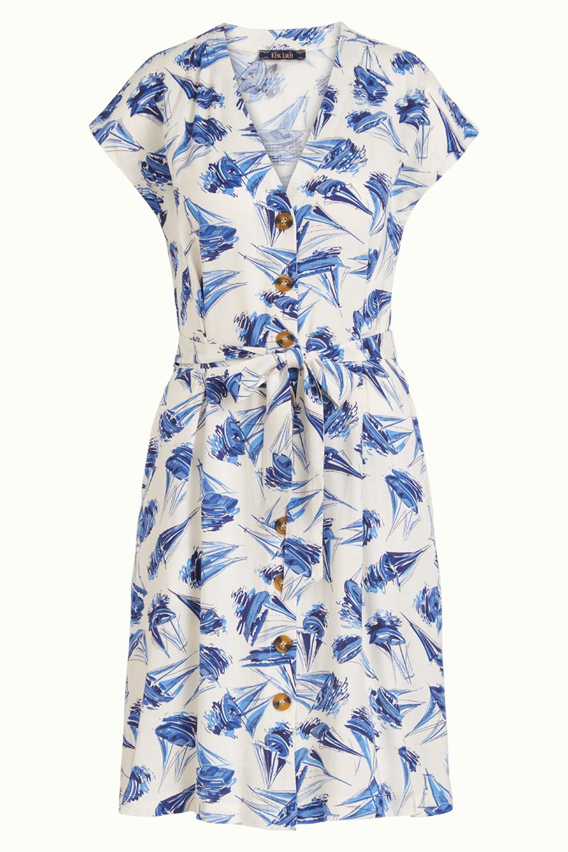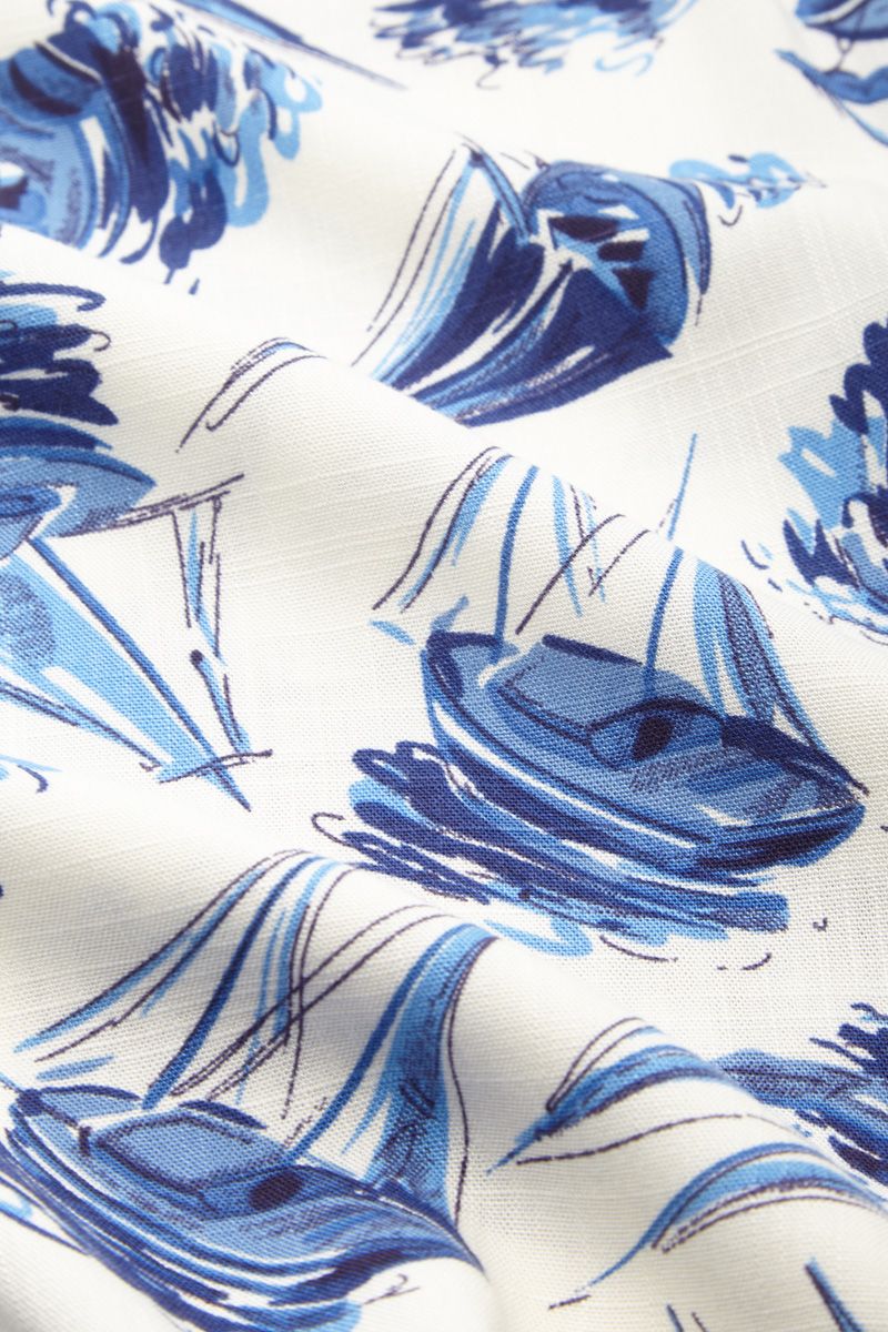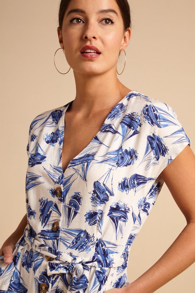 Sommerkleid mit Boot-Print, lockere Passform, V-Ausschnitt, kurze angeschnittene Ärmel, durchgehende Knopfleiste, zwei Eingrifftaschen in der Seitennaht