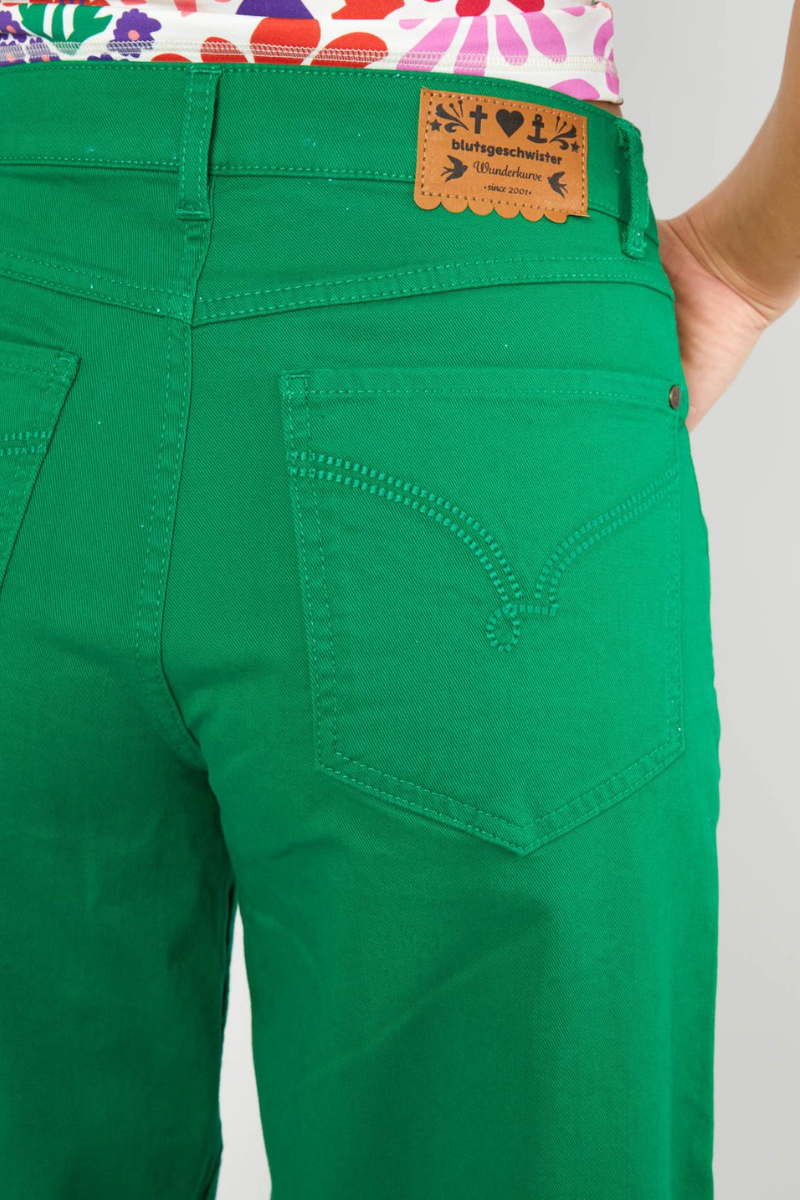Jeans von Blutsgeschwister mit hoher Taille. Die wadenlange Länge und der Stretchanteil sorgen für einen bequemen Sitz. Die Logonieten mit Schwalbenprägung und die aufgesetzten Gesäßtaschen mit Wunderkurve-Stickerei verleihen dieser Hose das gewisse Etwas. Der abgesteppte Bund mit fünf Gürtelschlaufen sowie Reißverschluss und Knopf runden das Design ab. Das weite ausgestellte Bein sorgt für einen lässigen Look.