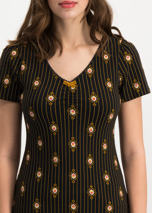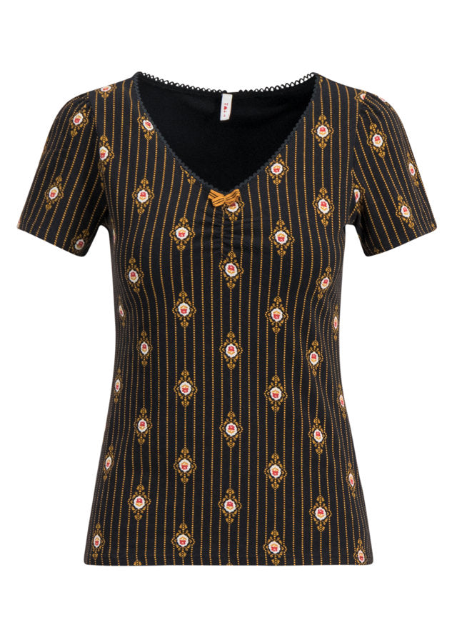 Unkompliziertes Alltags-Shirt aus einer weichen Baumwoll-Elasthan-Textur für musterstarke Prin(t)zessinnen! Das schmal geschnittene Lieblingsstück mit einfachem V-Ausschnitt und liebevollen Veredelungen ist ein kombinationsfreudiges T-Shirt im blutsgeschwisterlichen Stil.