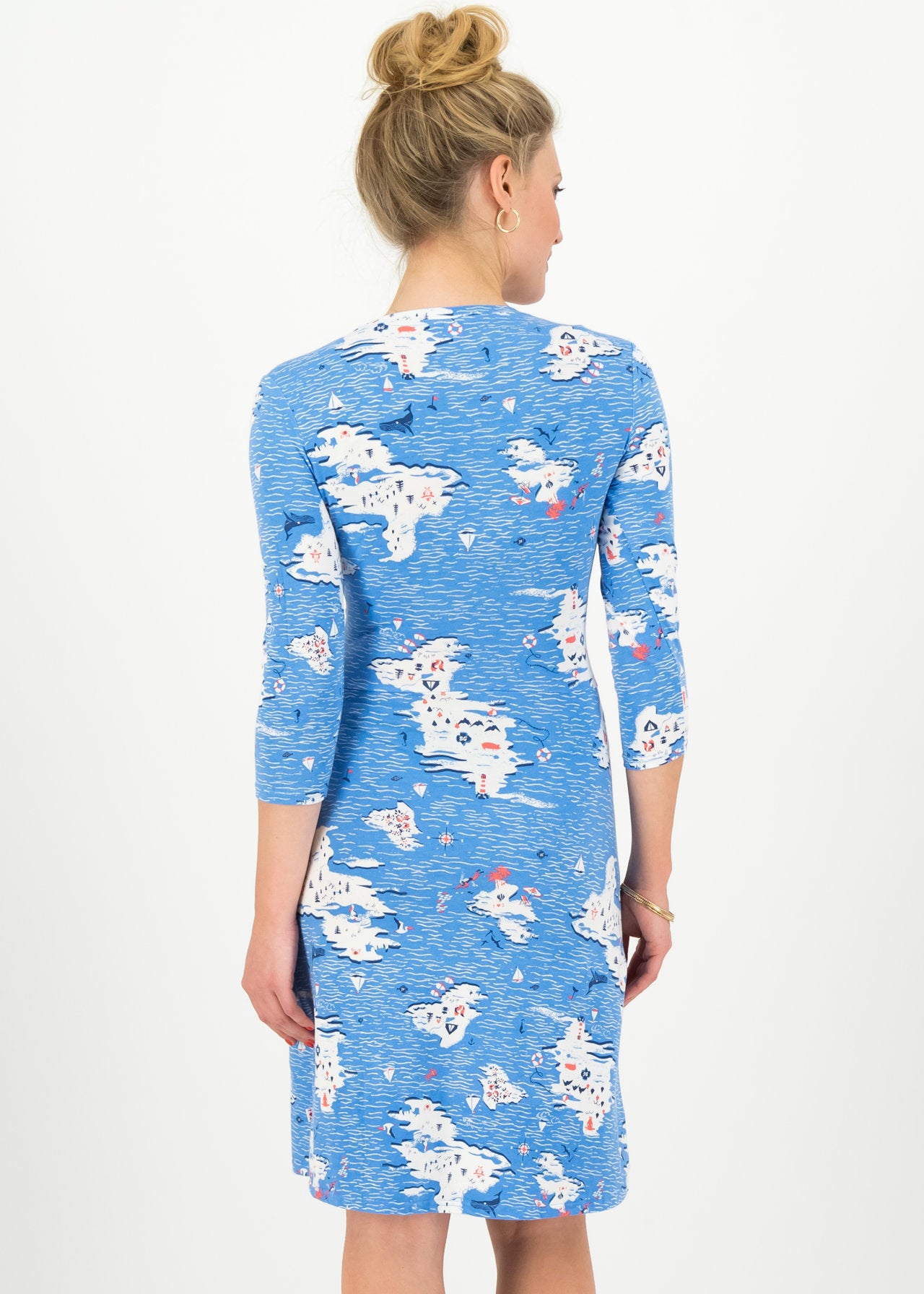 Gemütliches Single-Jersey-Kleid aus einem anschmiegsamem Bio-Baumwoll-Elasthan- Mix, auf welchem naturverbundene Allover-Artworks in satten Farben blühen! Das figurnah geschnittene Kleid mit knieumspielender Länge wird durch den V- Ausschnitt mit Wickeleffekt und individuell anpassbarer Dekolleté-Tiefe zu einem femininen Blickfang.
