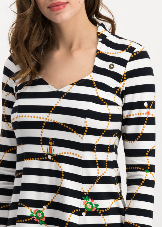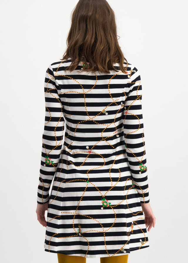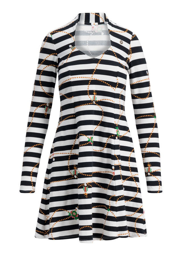 Kurzes Single-Jersey-Kleid aus einer anschmiegsamen Baumwoll-Elasthan-Qualität, mit p(r)unkvollen Allover-Artworks aus dem blutgeschwisterlichen Königshaus. Das adrette Mini-Kleid mit gemütlicher Passform und schwingendem Rock-Saum hat einen diamantenförmigen Ausschnitt, der einen hinreißenden Rahmen für jedes Dekolleté zaubert.