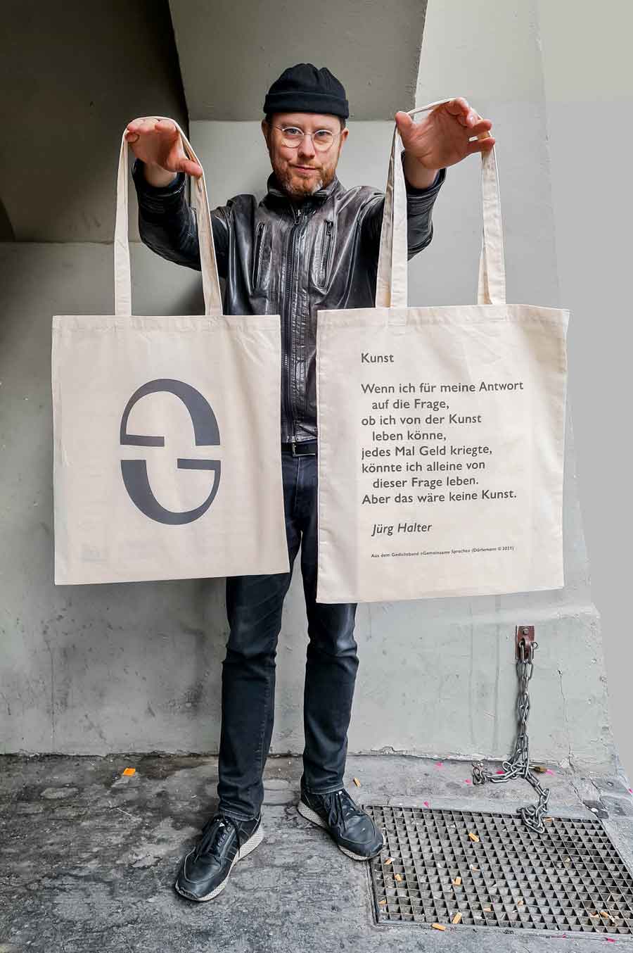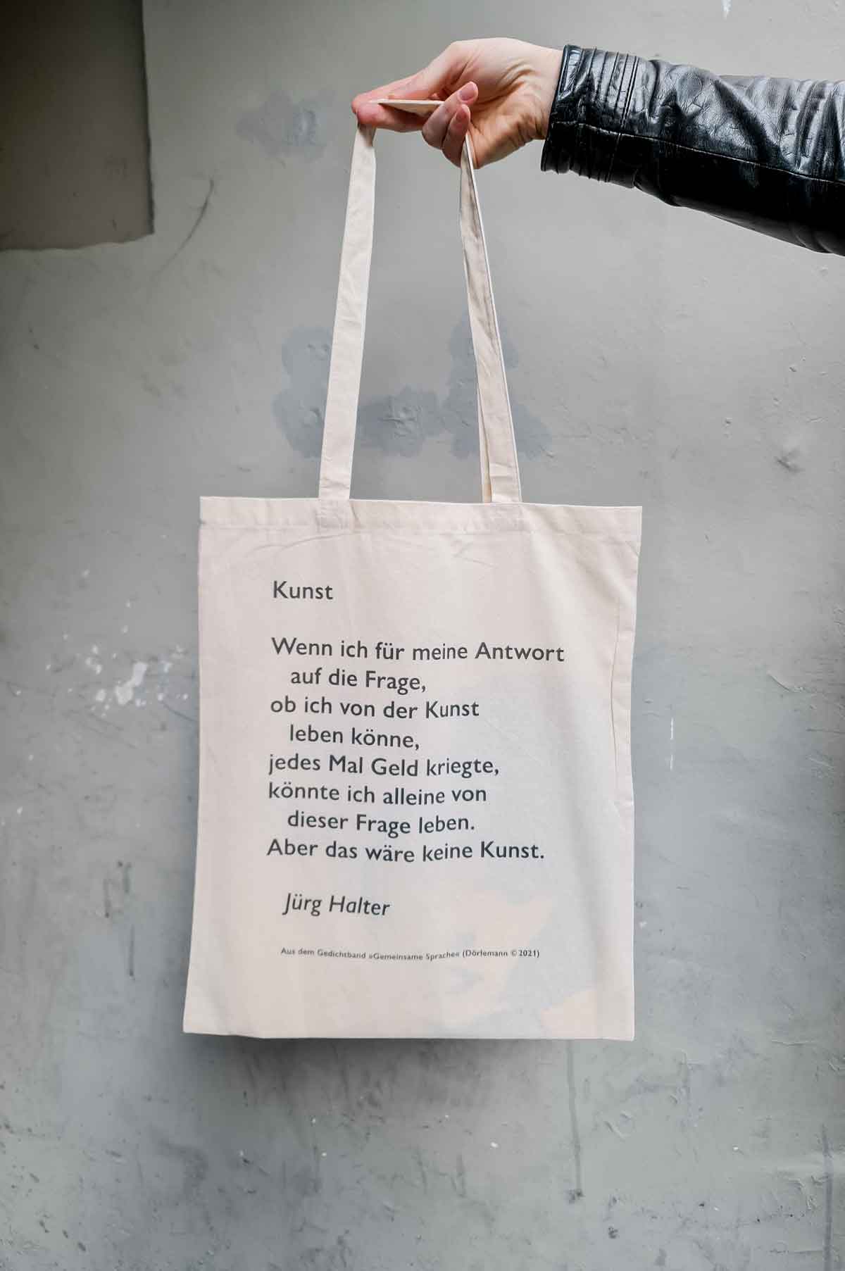 DIE Stofftasche zur Kulturkrise. Mit der Krisentasche von Jürg Halter kommen Sie beschwingter, mutiger und poetischer durch die Krise! Einerseits bedruckt mit einem durchaus ironischen Gedicht des bekannten Schweizer Schriftstellers aus seinem im Januar erscheinenden neuen Gedichtband „Gemeinsame Sprache“ (© Dörlemann, 2021). Andererseits verziert mit dem schönen Logo der Designerin Anneka Beatty, das auch auf dem Buchcover zu finden sein wird. Bedruckt wurde diese besondere Tasche in Bern.