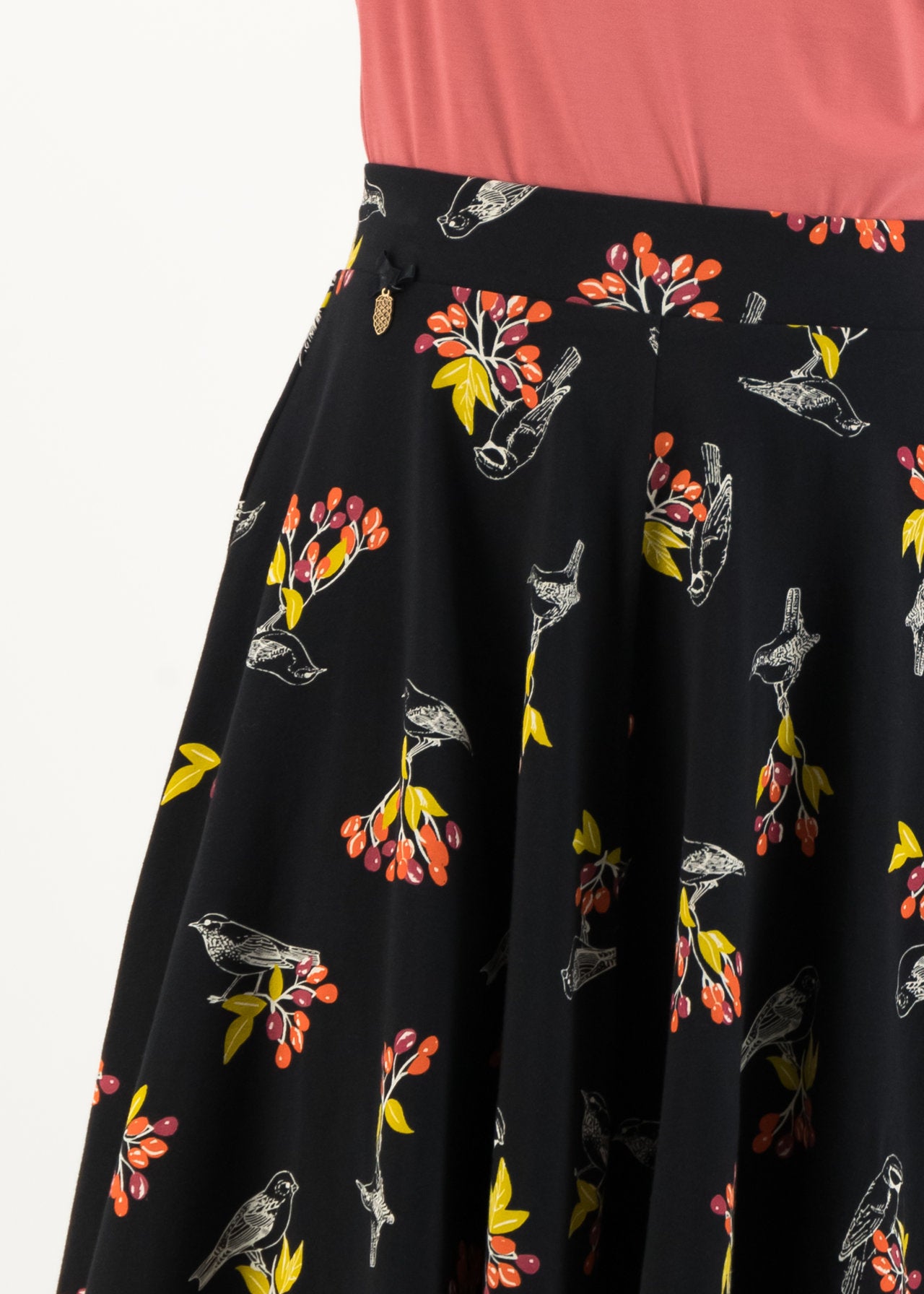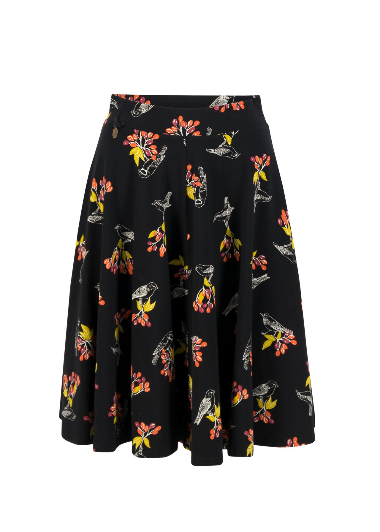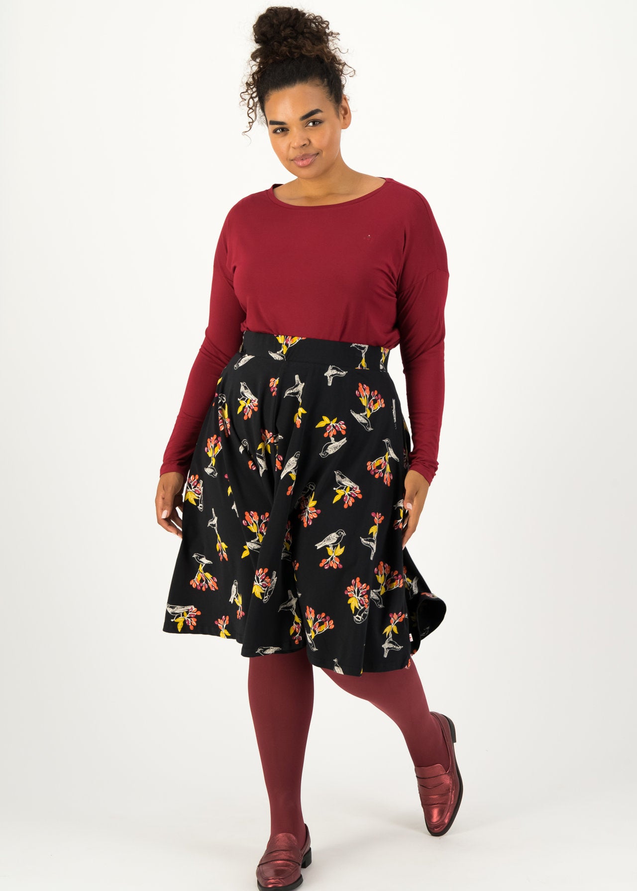 Weit ausgestellter Teller-Rock aus einer anschmiegsamen Baumwoll-Elasthan-Qualität in zertifizierter Bio-Qualität. Ein echter Figurschmeichler: Der gemütliche Bund mit Sitz in der Taille zaubert jeder Blutsschwester eine feminine Silhouette; höchster Tragekomfort dank elastischem Gummiband inklusive.